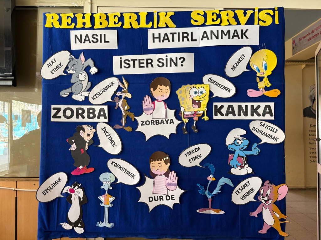 Okulumuzun özel hedefi olan ve Zorbalığa Hayır Elçisi Projesi kapsamında hazırlanan Akran Zorbalığı konulu rehberlik panosu.